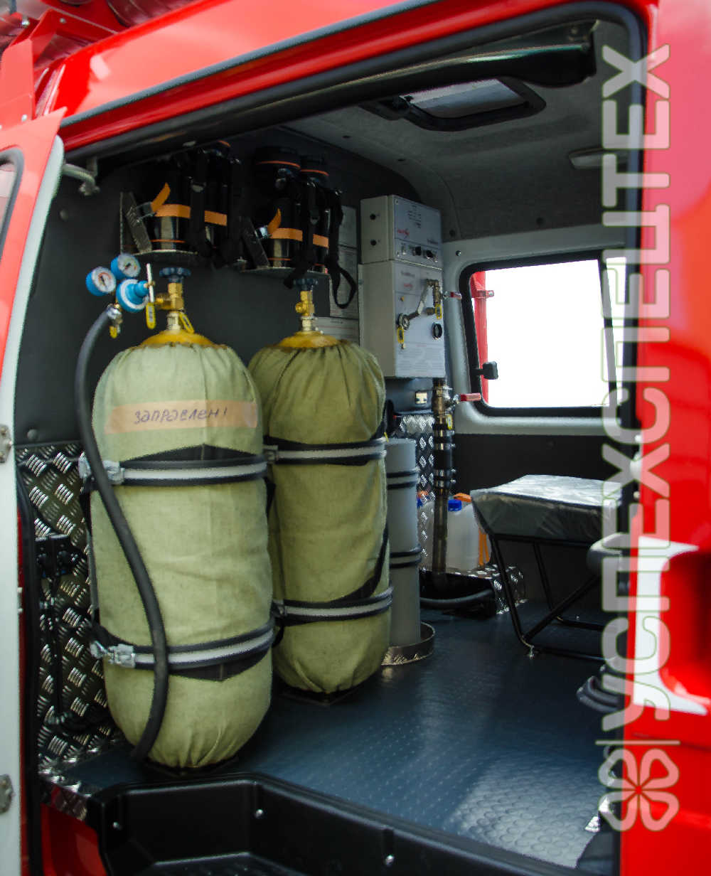 Система компрессионной пены NATISK-800KS. Привод компрессора воздушного от трансмиссии шасси. Рабочее давление 3-10 атм. Максимальный расход раствора 800 л/мин. Дальность струи из ствола ручного до 35 м. Максимальный расход сжатого воздуха 4 600 л/мин. Кратность 5-20. Дозирование пенообразователя 0,6 – 6%. Внутренний диаметр ствола ручного 25 мм (3 шт). Объем производимой пены от 25 000 л («мокрая пена») до 100 000 л («сухая пена»). Базовое шасси КАМАЗ-43118. Колесная формула 6х6. Мощность двигателя 300 л.с. Экологический класс Евро-5. Боевой расчет 6 чел. Цистерна для воды 5 000 л. Пенобак 300 л. Насос пожарный НЦПН-40/100.