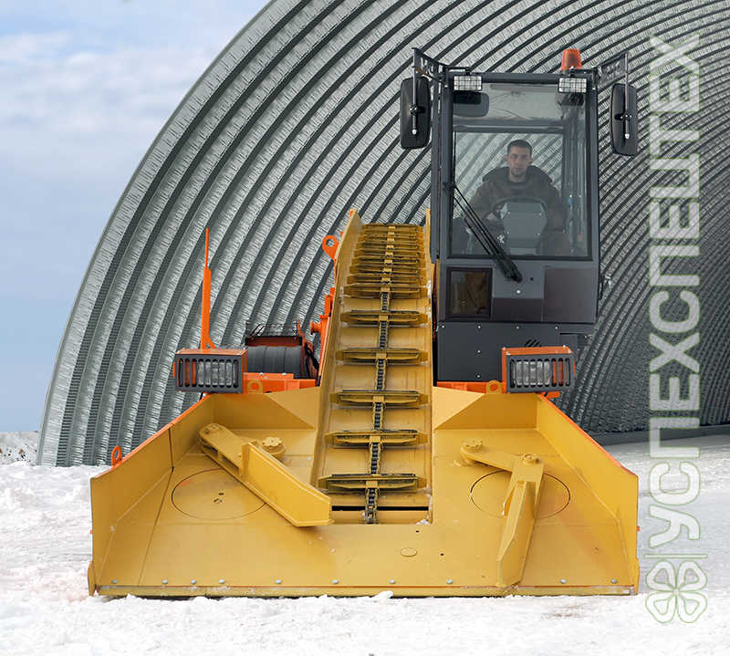 Снегопогрузчик ДМ09 с лаповым питателем и скребковым транспортером предназначен для погрузки предварительно собранного в валы и кучи снега в транспортные средства.