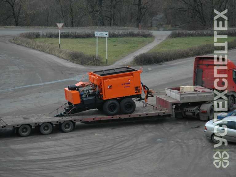 Машина для ямочного ремонта Р-310М предназначена для рационального и качественного ремонта дорожных покрытий методом пневмонабрызга с помощью щебня различных фракций и битумной эмульсии. Технологическое оборудование машины смонтировано на двухосном полуприцепе, транспортируемом тракторами МТЗ-1221, ЛТЗ-155, Т-150К, МТЗ 82.1/82.2