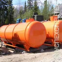 Стандартное оснащение: заливная горловина, дыхательный клапан, сливной кран в защитном коробе, волногасители, люк-лаз, лестница, площадка для обслуживания, металлическая защитная рама с контейнерными замками. -