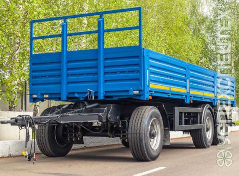 Прицеп бортовой предназначен для транспортировки различных грузов, в том числе сыпучих, а так же зерновых сельскохозяйственных культур. Бортовая платформа: стальная, прямоугольного сечения. Боковые и задние борта платформы сочленены из двух бортов. Верхний борт – неподвижный, жестко крепится к стойкам платформы. Нижний борт – подвижный с верхней навеской, шарнирно крепится к нижней кромке верхнего неподвижного борта. Запоры бортов – механические, открываются вручную. Конструкция платформы включает в себя две пары стяжек средних стоек, увеличивающих жесткость кузова в поперечном направлении. Платформа оснащена быстросъемным тентом. Тент сворачивается в продольном направлении с помощью наматывающего устройства. В передней части платформы имеется откидная площадка для удобства обслуживания тента.