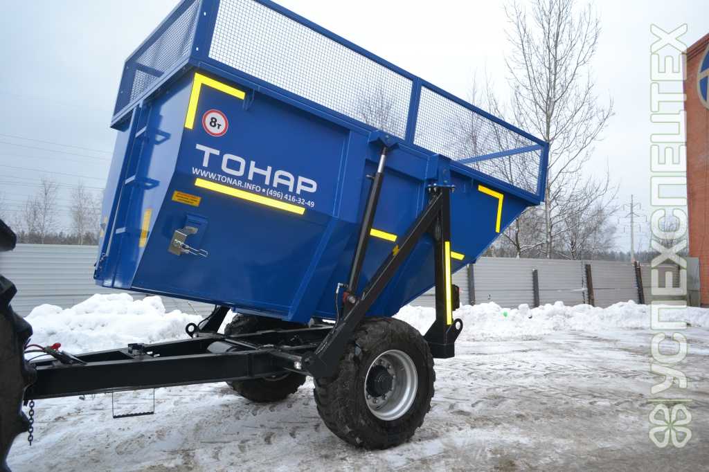 Увеличенный объем кузова до 16 куб. м. (с надставными бортами). Грузоподъемность – 8 т., собственный вес -2,4 т. Основу шасси составляет ось Тонар-9040 с жёстким креплением к раме. Прицеп оснащён 2мя гидроцилиндрами, позволяющими осуществлять подъём кузова на 87 градусов! Минимальный объём масляного бака трактора- 14 литров.