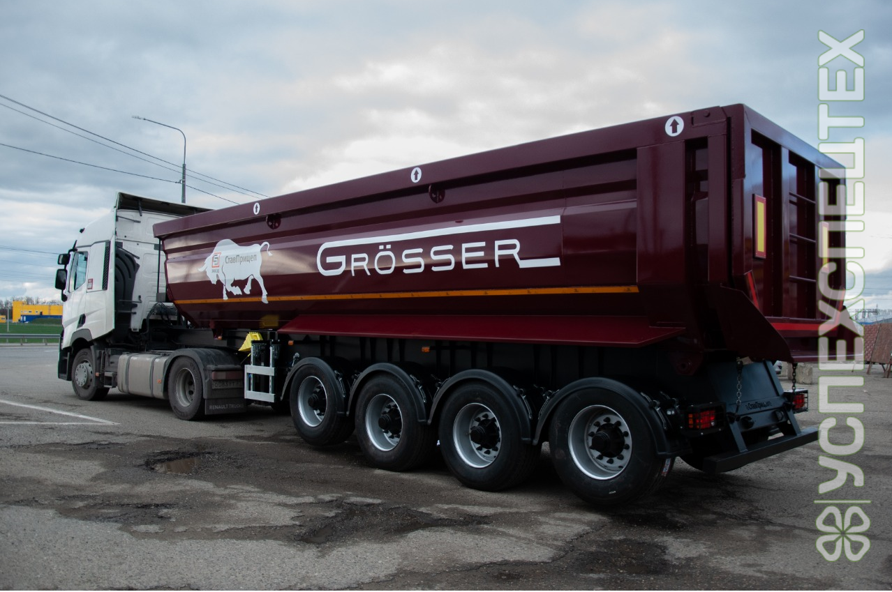 Представленная модель 95402-0000050 – это вариант с повышенной грузоподъемностью (95,700 кг) с усиленной ходовой частью и подвеской. Конструкция бортов (из двух частей) предотвращает засыпание колес при разгрузке. Управление разгрузкой в данной модели осуществляется с выносного пульта, который подключается к панели слева за кабиной тягача.