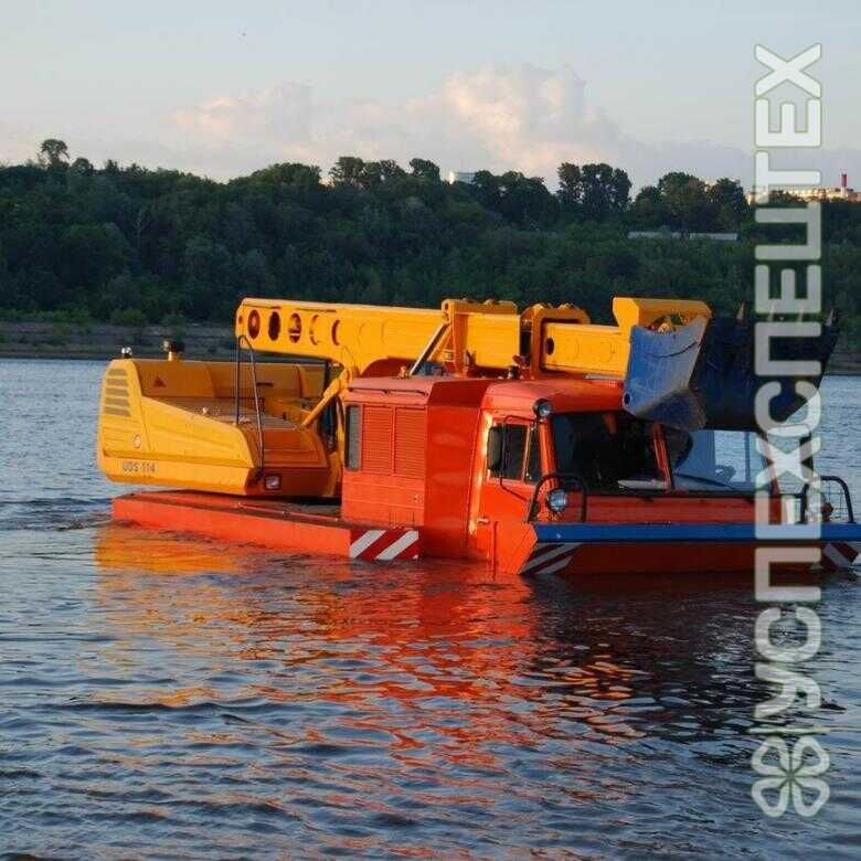Снаряженная масса, кг 26000. Среднее давление на грунт, кг/см2 0,2. Ширина пневмогусеницы, мм 1260. Максимальная скорость, км/ч 18. Максимальная скорость на плаву, км/ч 5. Количество мест в кабине 3. Габаритные размеры (LxBxH), мм 10700х4160х4000 ТТМ. Двигатель ЯМЗ-238Б Турбодизель, V8, 14,86 л., 300 л.с.. Трансмиссия 4-ст, механическая. Дополнительное оборудование Экскаваторная установка UDS-114R09. Вместимость ковша, м3 0,63. Наибольшая глубина копания, м 4,3. Наибольшая высота разгрузки, м 3,6. Ход телескопической стрелы, м 4,15.