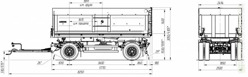 боковые борта состоят из двух частей с верхней и нижней навеской, два гидроцилиндра, резина 10R20