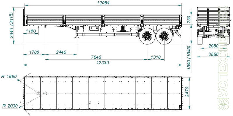 Радиус габарита передней части полуприцепа не более, мм. 2 040