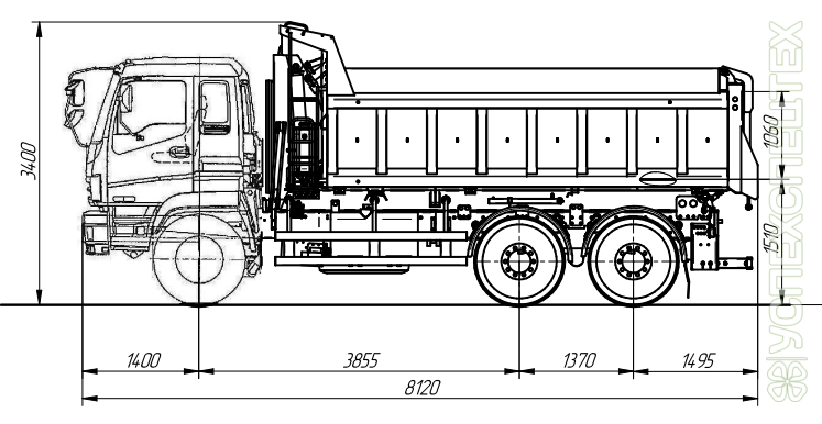 Автомобиль-самосвал предназначен для перевозки различных сыпучих строительных, промышленных грузов. Платформа цельнометаллическая, стальная. Разгрузка осуществляется назад, через задний борт с верхней навеской Запоры заднего борта автоматические, открываются при подъеме платформы. Основание платформы с несущим каркасом и креплением гидроцилиндра в передней части. Опрокидывающее устройство платформы гидравлическое с приводом от насоса через коробку отбора мощности. Управление подъемом электропневматическое из кабины. Для эксплуатации в зимний период автомобиль оснащен коробкой переключения газов, обеспечивается обогрев всего днища кузова, переднего борта до половины высоты, боковых бортов по вертикальным усилителям.