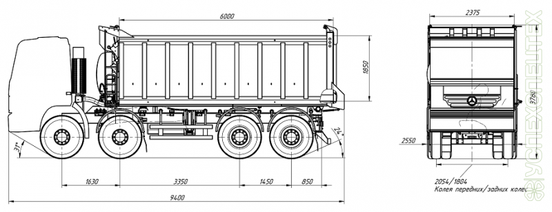 Внутренние размеры самосвальной установки без надставных бортов / объем кузова 6000х2380х1400мм / 20 м³