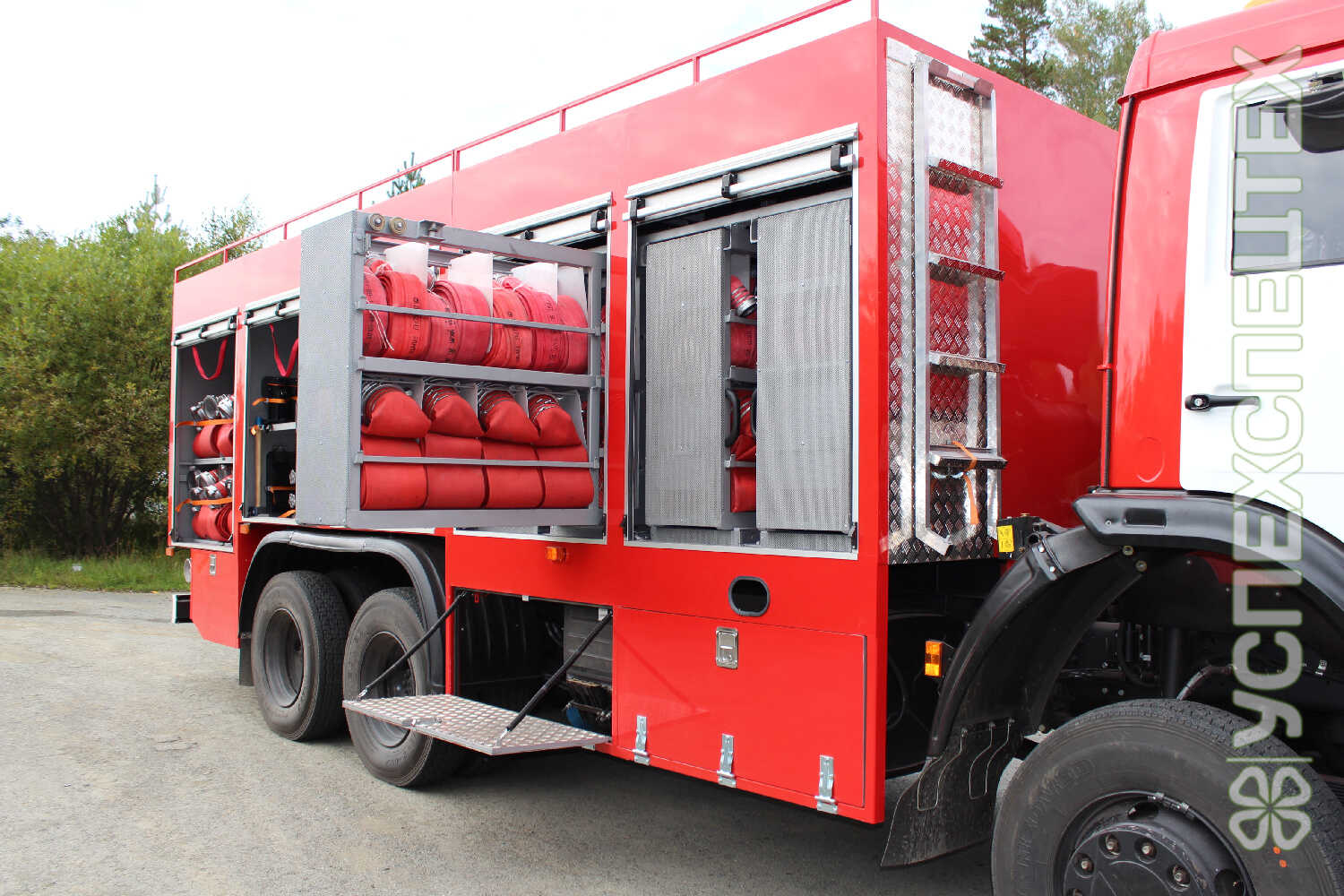 Колесная формула 4х2. Полная масса пожарного автомобиля, кг 14725. Габаритные размеры (ДхШхВ), м 7550х2500х3700. Боевой расчет, включая водителя, чел. 2/3. Пожарный рукавный автомобиль АР-4 на шасси КАМАЗ- это специальный пожарный автомобиль предназначенный для тушения пожаров в населенных пунктах и на промышленных объектах совместно с пожарными автонасосными станциями и служит для доставки к месту пожара боевого расчета, пожарно-технического вооружения, механизированной прокладки и сбора магистральных рукавных линий и подачи в очаг пожара воды или воздушно-механической пены с помощью стационарного лафетного ствола.