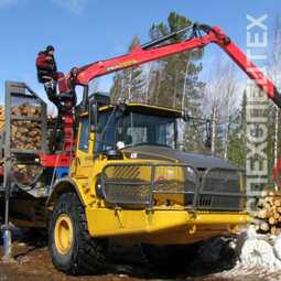 СпецификацияДанный сортиментовоз создан на базе сочлененного самосвала A25F и может использоваться в двух вариантах: как лесовоз с прицепом и как лесовоз с полуприцепом. В обоих вариантах возможна погрузка сортиментов различной длины от 3 до 6 метров. A25F имеет шесть передач для движения вперед и две передачи для движения назад. Трансмиссия оборудована 100% блокируемыми дифференциалами и позволяет использовать их блокировки в различных комбинациях для увеличения эффективности использования машины и улучшения ее проходимости.