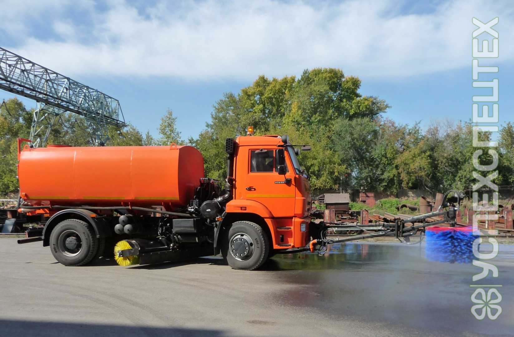 При очистке дорожного полотна от мусора во время летнего содержания автомобильных дорог на переднем специальном бампере устанавливается водяная гребенка с форсунками для подавления пыли.