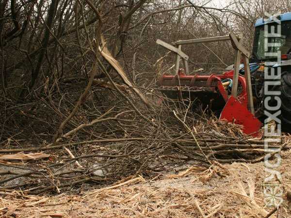 срезает и измельчает деревья, кусты и ветки до 20 см в диаметре;
