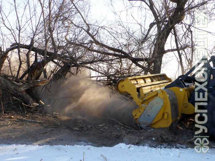срезает и измельчает деревья, пни, кусты диаметром до 40 см;