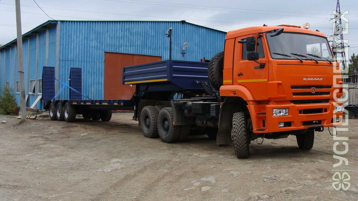 Длинномер бортовой с тягачём 6х4. Длина платформы 13,6 метра, г/п 30 тонн. Борта съёмные. Есть стойки.