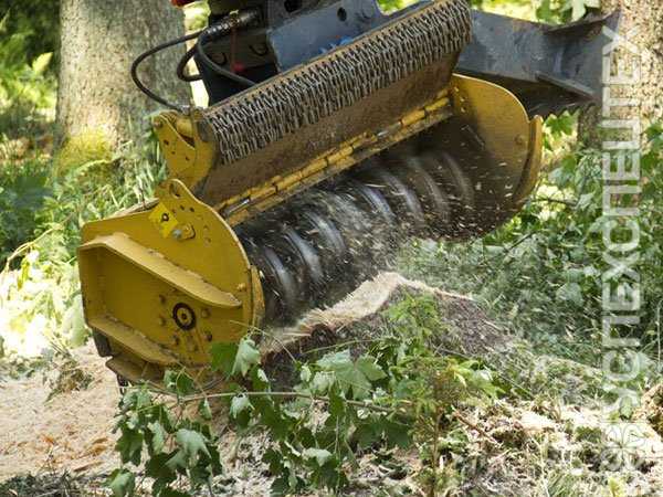срезает и измельчает деревья, кусты и ветки до 20 см в диаметре;