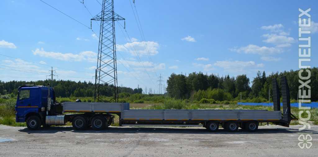 Высота седельно-сцепного устройства тягача должна быть, мм. 932 Масса перевозимого груза, кг. 30 290 Масса снаряженного полуприцепа с запасным колесом, не более, кг. 11 000 Полная масса полуприцепа, не более, кг. 41 290 Распределение полной массы прицепа, кг. 10 860 (на ССУ), 30 430 (на колесную тележку)
