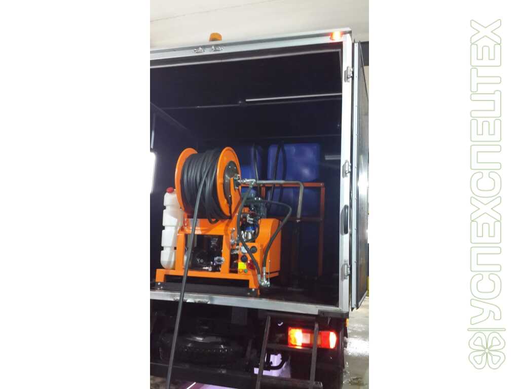 Насос и барабан с РВД размещены в заднем отапливаемом отсеке. Задний отсек имеет теплозащитную облицовку и подогревается автономным электрофакельным отопителем. К машине прилагается набор из 2-х размывочных головок, которые применяются в зависимости от диаметра очищаемых труб и степени их засоренности.