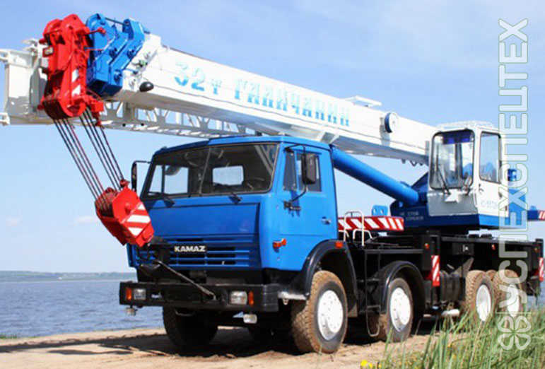 Грузоподъемность - 32 тонны, вылет стрелы - 30 м.,