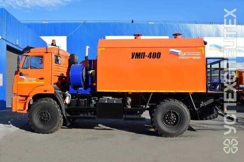 УМПП-400 УЗСТ 6892-02 на шасси КАМАЗ-43502-3036-45/3038-45 без спального места, вентилятор ВР-280-46-5, горелки Riello RG4S (220 В) – 2 шт., бак топливный 350 л., теплообменник - двухсекционный трубчатый из нержавеющей жаропрочной стали, количество выводов для рукавов - 3, вместимость пеналов для рукавов - 10, средства безопасности.