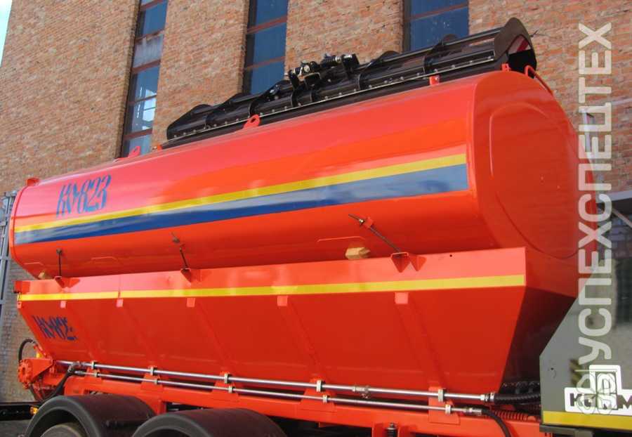 По всей длине кузова установлены щетки для очистки цепей и скребков и защитные поддоны, предотвращающие просыпания ПСС на агрегаты шасси