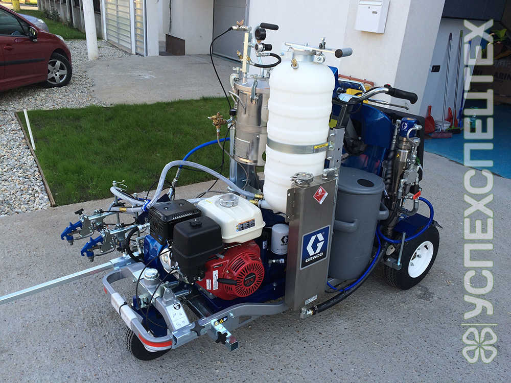 Машина для разметки холодным спрейпластиком. Внутреннее смешивание в смесительной головке. Оснащается разметочным компьютером. Запуск двигателя электростартером. Подача стеклошариков. Скорость передвижения до 16 км/час. Два бака для компонентов и бак для растворителя. Съёмный пистолет для спрейпластика и стеклошариков. Автоматическая промывка.