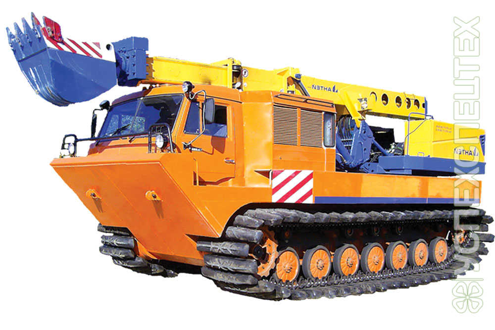 Плавающий гусеничный снегоболотоход с экскаваторной установкой EW-25-М1 с полноповоротным ковшом предназначен для проведения аварийно-восстановительных работ на нефте- газопроводах, может эксплуатироваться в сложных природно-климатических условиях, включая снежную целину и болота всех категорий. Эксплуатируется на грунтах с низкой несущей способностью, включая снежную целину без ограничения глубины снежного покрова, сыпучие пески, болота всех категорий и открытые водоемы. На большие расстояния машина может транспортироваться на прицепе типа трал.
