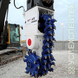 СпецификацияЦепная траншейная фреза EK 800 навешивается на экскаватор массой от 25 до 45 тонн. Цепная фреза EK 800 предназначена для рытья траншей в прочных и каменистых грунтах, а также в горных породах прочностью на одноосное сжатие до 80 МПа. Привод гидромотора траншейной цепной фрезы осуществляется от гидросистемы экскаватора. Требования к гидросистеме экскаватора: давление 300-350 бар; гидропоток 250-300 л/мин.