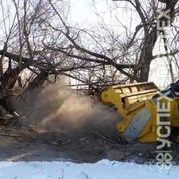 срезает и измельчает деревья, пни, кусты диаметром до 40 см;