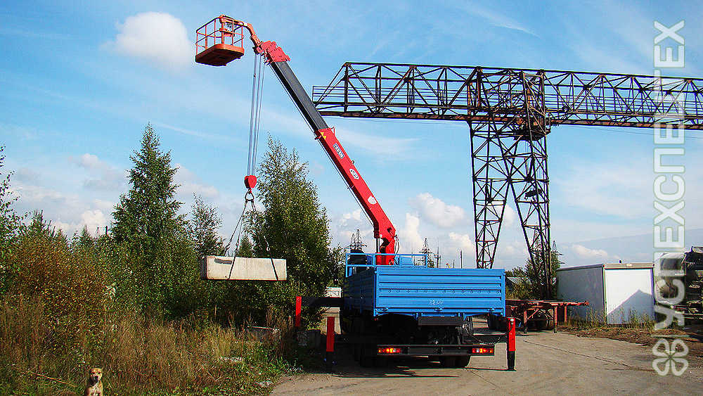 Грузоподъемность стрелы 7т, грузоподъемность автомобиля 8т, вылет стрелы 19м, габариты платформы 7х2,40м