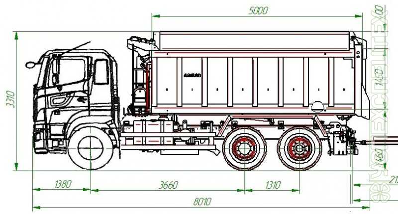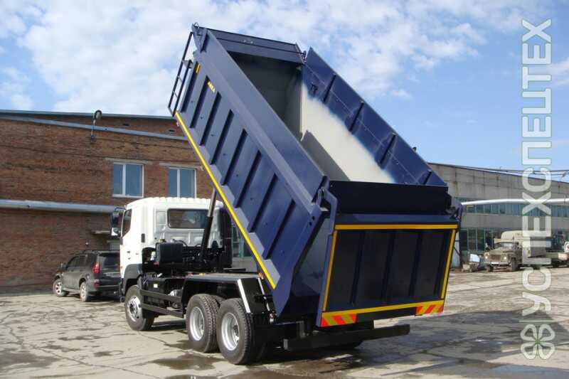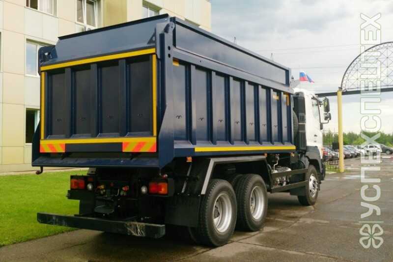 Автомобиль-самосвал предназначен для перевозки различных сыпучих строительных, промышленных грузов. Платформа стальная, коробчатого типа. Основание платформы с несущим каркасом и креплением гидроцилиндра в передней части. Запоры заднего борта автоматические, открываются при подъеме платформы. Опрокидывающее устройство платформы гидравлическое с приводом от насоса через коробку отбора мощности. Управление подъемом электропневматическое из кабины. Платформа имеет обогрев днища по 4-х канальной системе, дополнительный обогрев в передней части кузова и задних стоек.