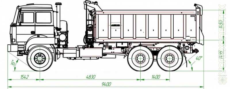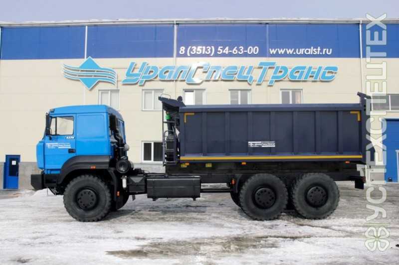 Автомобиль-самосвал предназначен для перевозки различных сыпучих строительных, промышленных грузов и для дальнейшего дооборудования под коммунально-дорожную машину. Платформа стальная, квадратного сечения. Задний борт имеет верхнюю навеску. Запоры заднего борта механические, срабатывают автоматически при подъеме/опускании платформы. Управление подъемом электропневматическое из кабины.