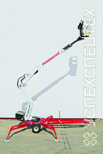 Прицепной подъемник пригодится в тех случаях, когда использование стреловых самоходных подъемников невозможно из-за слабой несущей способности грунта. Он имеет сравнительно малый вес и гидравлические опоры. Управление может осуществляться как из корзины, так и снизу. В качестве источника питания прицепного подъемника используется обычная однофазная электросеть (230 В). Эти подъемники имеют стрелу телескопического или коленчатого типа, а также привод бокового поворота рабочей корзины. Преимущество прицепных подъемников – это небольшой вес, большой вылет стрелы, возможность буксировки.