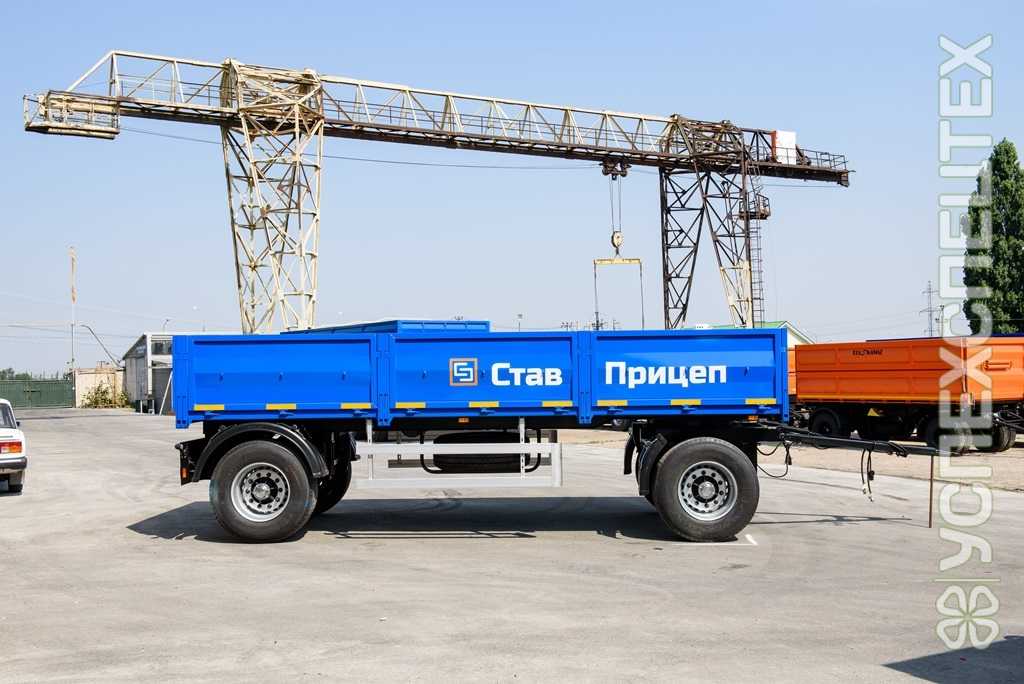Прицеп бортовой предназначен для транспортировки различных грузов, в том числе сыпучих, а так же зерновых сельскохозяйственных культур. Бортовая платформа: стальная, прямоугольного сечения. Боковые и задние борта платформы сочленены из двух бортов. Верхний борт – неподвижный, жестко крепится к стойкам платформы. Нижний борт – подвижный с верхней навеской, шарнирно крепится к нижней кромке верхнего неподвижного борта. Запоры бортов – механические, открываются вручную. Конструкция платформы включает в себя две пары стяжек средних стоек, увеличивающих жесткость кузова в поперечном направлении. Платформа оснащена быстросъемным тентом. Тент сворачивается в продольном направлении с помощью наматывающего устройства. В передней части платформы имеется откидная площадка для удобства обслуживания тента.