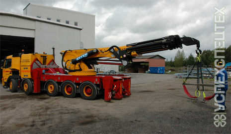Грузоподъемность автомобиля 20т, грузоподъемность стрелы 5,т, габариты платформы 12х2,37м, вылет стрелы 12 метров