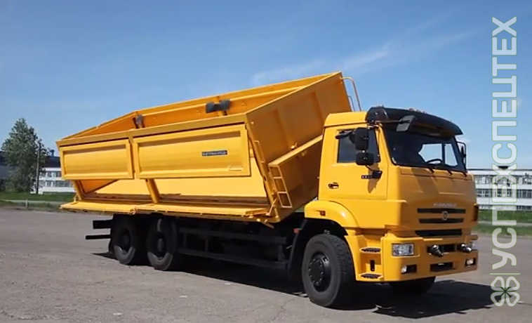 Для перевозки сыпучих грузов кузов оборудован задним откидным бортом с верхней осью вращения. Грузоподъемность 45 тонн.
