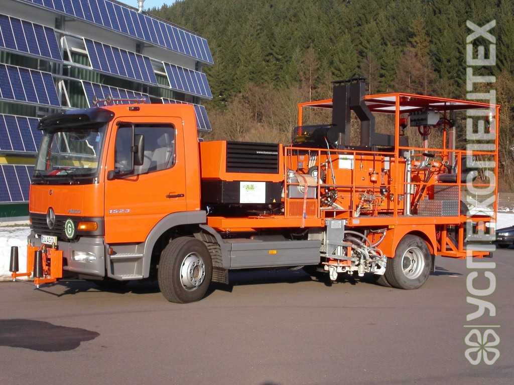 Машина для разметки холодным спрейпластиком. Внутреннее смешивание в смесительной головке. Оснащается разметочным компьютером. Запуск двигателя электростартером. Подача стеклошариков. Скорость передвижения до 16 км/час. Два бака для компонентов и бак для растворителя. Съёмный пистолет для спрейпластика и стеклошариков. Автоматическая промывка.