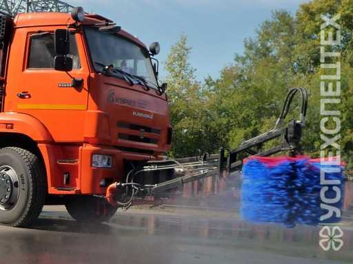 При очистке дорожного полотна от мусора во время летнего содержания автомобильных дорог на переднем специальном бампере устанавливается водяная гребенка с форсунками для подавления пыли.