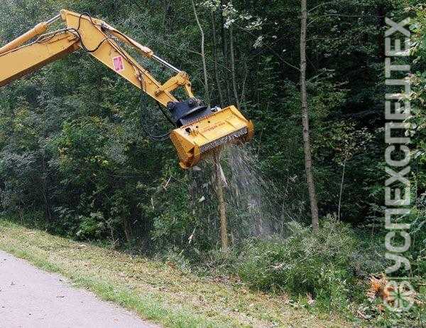 срезает и измельчает деревья, кусты и ветки до 25 см в диаметре;