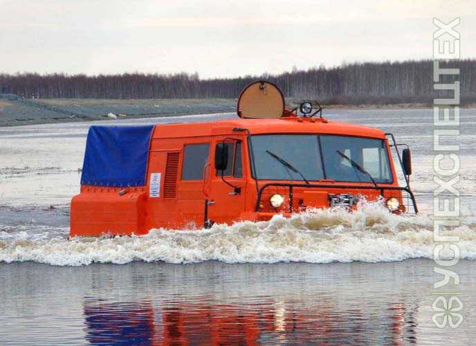 Снаряженная масса, кг 6550. Грузоподъемность, кг 3000. Среднее давление на грунт, кг/см2 0,17. Максимальная скорость, км/ч 54. Максимальная скорость на плаву, км/ч 5. Количество мест в салоне 6. Количество спальных мест 2. Запас топлива, л. 400. Размер грузовой платформы (LxBхH), мм 2350х2200. Габаритные размеры (LxBxH), мм 6286x2500(2870)x2700. Ширина по корпусу, мм 2500. Двигатель Cummins-4ISBe185 турбодизель, Р4, 4,5 л., 185 л.с.. Коробка передач 6-ст., механическая, ZF 6S1000 (Германия). Управление автомобильного типа (рулевое колесо) с гидроусилителем. Преодолеваемый подъем на твердом сухом грунте с полной нагрузкой, ° не менее 30. Допускаемый боковой крен на твердом сухом грунте, ° не менее 25. Минимальный радиус поворота, м 2,2.