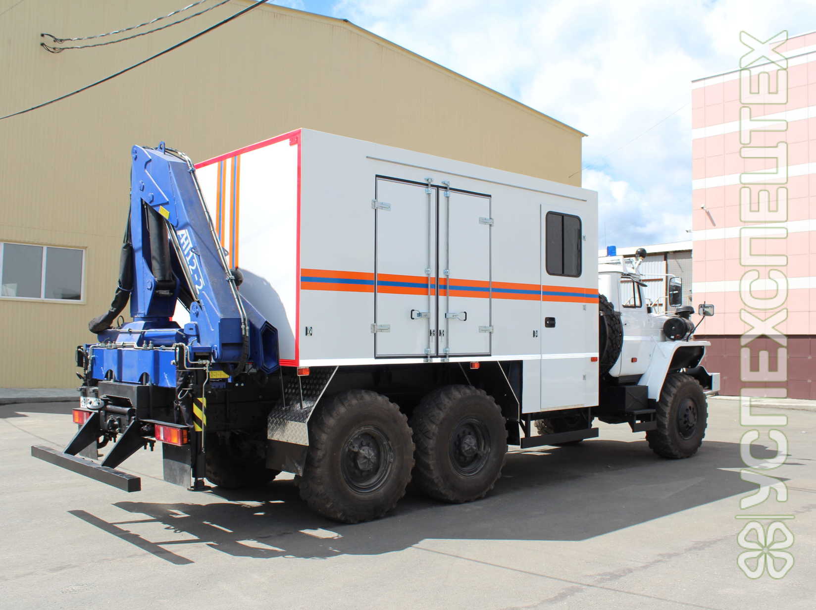 Комплектация: гидравлический аварийно-спасательный инструмент, генератор переменного тока 220V, осветительное оборудование, средства связи и оповещения, набор пневмодомкратов, режущее оборудование, средства защиты органов дыхания, пожарное оборудование. Возможна Комплектация высокоэффективными мобильными установками NATISK.