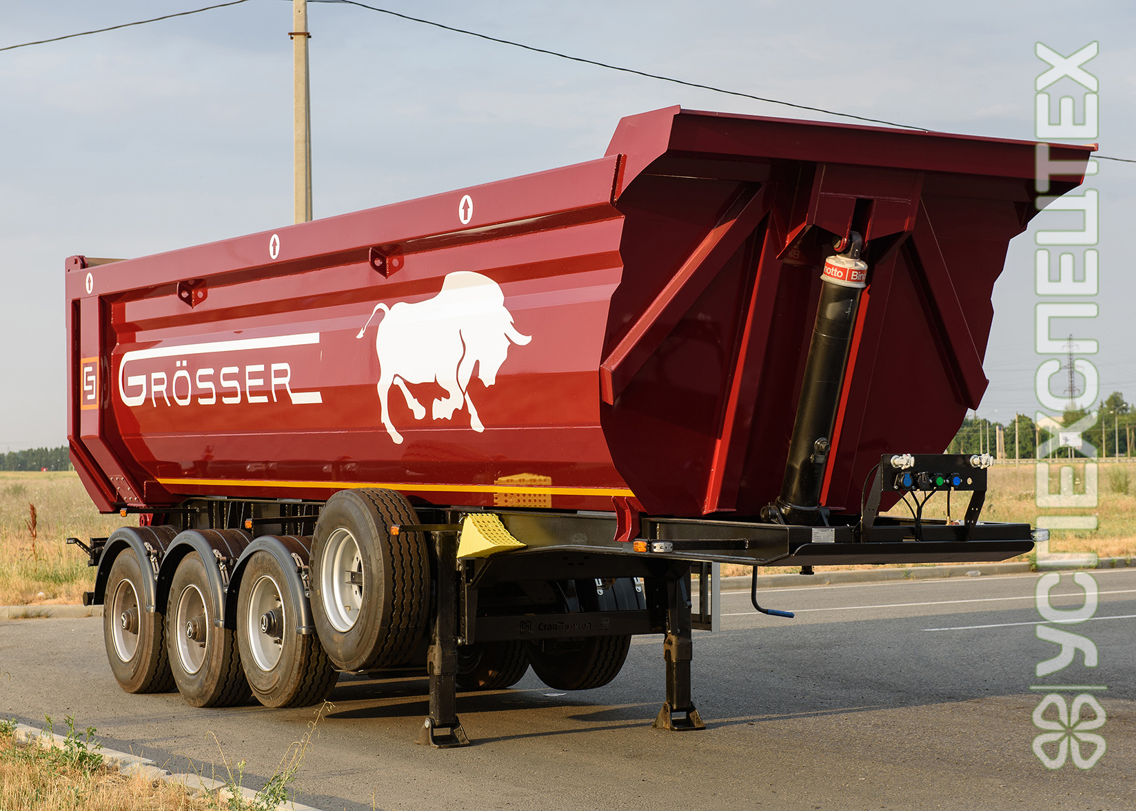 Представленная модель 95402-0000050 – это вариант с повышенной грузоподъемностью (95,700 кг) с усиленной ходовой частью и подвеской. Конструкция бортов (из двух частей) предотвращает засыпание колес при разгрузке. Управление разгрузкой в данной модели осуществляется с выносного пульта, который подключается к панели слева за кабиной тягача.