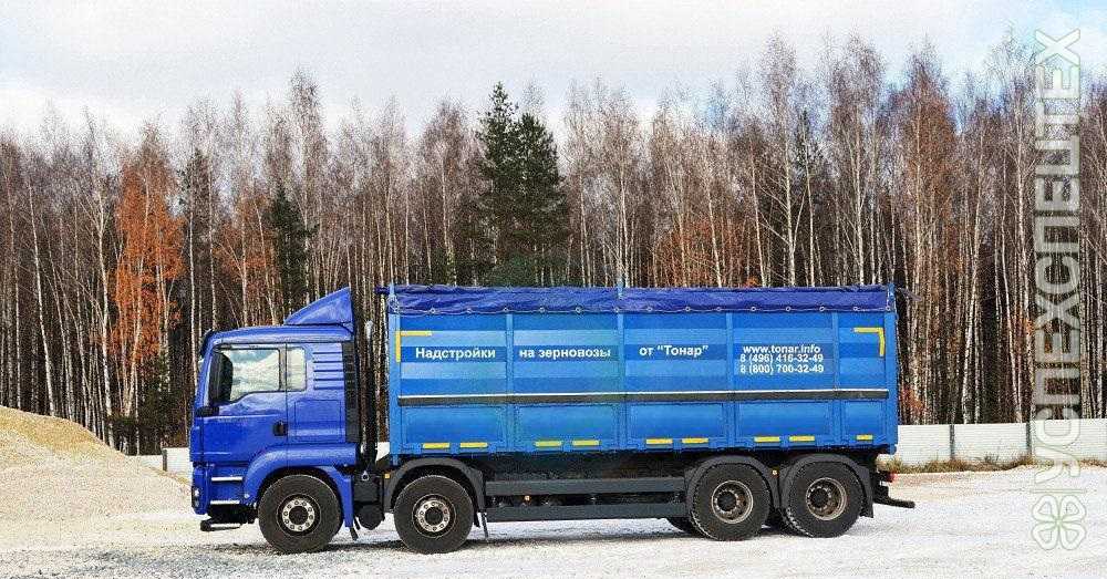 Надстройки для перевозки зерновых культур могут быть выполнены на шасси любого производителя. Объём кузова, куб.м. 35,8 Масса снаряженного транспортного средства, кг 14 000 Полная масса на шасси, кг. 35 000 Распределение массы снаряжённого транспортного средства по осям, кг 8 000 (на первую ось); 8 000 (на вторую ось), 19 000 (на заднюю тележку)