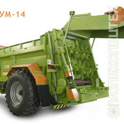 СпецификацияРОУМ-14 - единственный производимый в России одноосный разбрасыватель твердых органических удобрений грузоподъемностью 14 т. Предназначен для поверхностного внесения в почву твердых органических удобрений.