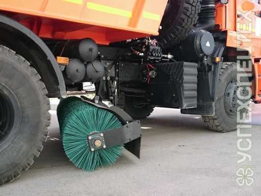 При очистке дорожного полотна от мусора во время летнего содержания автомобильных дорог на переднем специальном бампере устанавливается водяная гребенка с форсунками для подавления пыли.