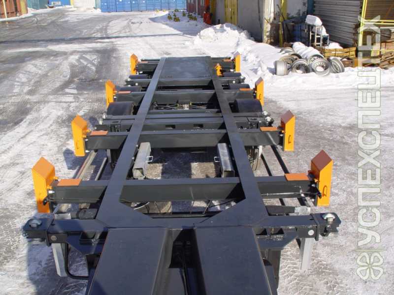Рама сварная, состоит из трех частей, вставленных одна в другую, с возможностью выдвижения передней и задней частей относительно средней части и поперечными элементами, с устройствами для крепления и фиксации контейнеров