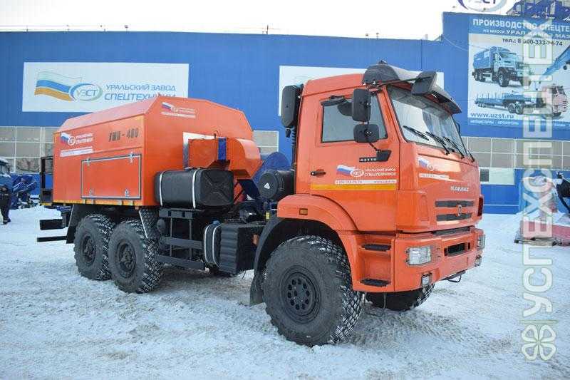 УМПП-400 УЗСТ 6892-02 на шасси КАМАЗ-43502-3036-45/3038-45 без спального места, вентилятор ВР-280-46-5, горелки Riello RG4S (220 В) – 2 шт., бак топливный 350 л., теплообменник - двухсекционный трубчатый из нержавеющей жаропрочной стали, количество выводов для рукавов - 3, вместимость пеналов для рукавов - 10, средства безопасности.