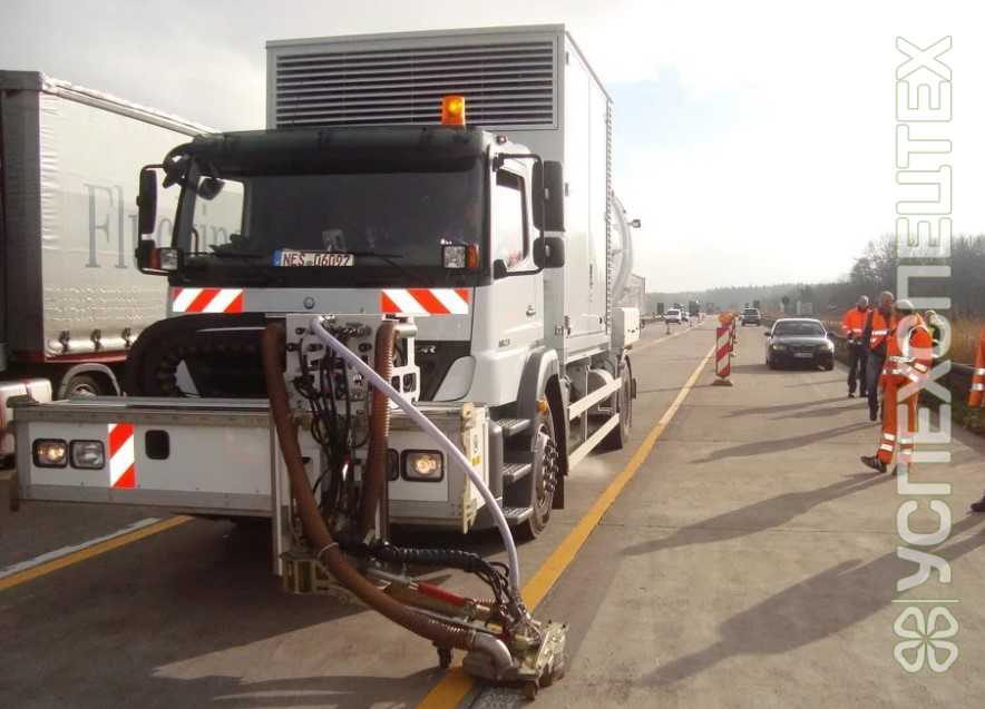 Водоструйный демаркировщик высокого давления 2500 бар фирмы PeelJet (Winter/Gruen) Германия. Вакуумная уборка отходов. После работы машины остаётся только мокрый след от воды, как после мойки. Удаление продольной и поперечной разметки, следов резины со взлётно-посадочных полос на аэродромах.