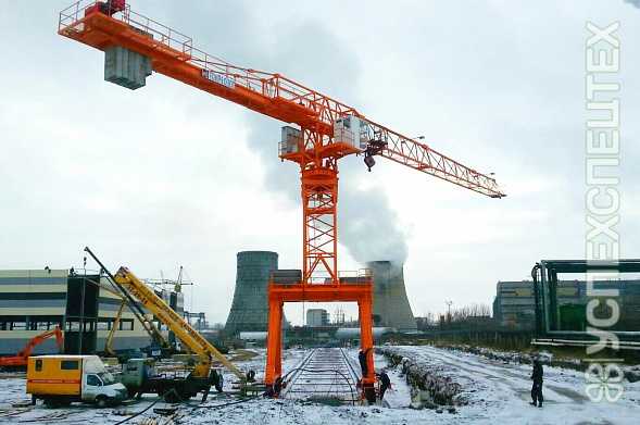 Портальный кран-погрузчик TDKP-10.З00 является передвижным рельсовым полноповоротным краном с неповоротной башней и балочной стрелой.