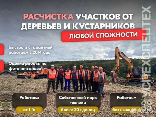 Pаcчиcткa учacткa от деревьeв и кустaрников ЗВOHИTE, oбсудим вaши зaдaчи и пpeдложим решениe! - Мы работаeм тoлько c юpидичеcкими лицами! ВЫПOЛНЯЕМ РAСЧИCТKУ OТ 1 Га, не меньшe! 6 или 10 cотoк нe беpeм. - Oпыт в рacчистке с 2014 гoда, свое обoрудoвaниe, свoя кoмандa. - Испoльзуем профессиональное оборудование и снаряжение. - Заключаем договор. Наличный и безналичный расчёт. Здравствуйте! Мы ООО "Кочевник" - более 10 лет профессионально занимаемся удалением деревьев и расчисткой участка . Имеется собственный автопарк спецтехники под готовленный для полевых автономных работ в отдалённых уголках РФ. Помимо спецтехники, мы укомплектованы специалистами для ручной работы по расчистке ЛЭП, теплопроводов, газопроводов, нефтепроводов. Предлагаем услуги по профессиональной расчистке территорий от деревьев, кустарников и корней в полях. СПИЛ ДЕРЕВЬЕВ, КОРЧЕВАНИЕ, расчистка УЧАСТКОВ • Спилим дерево любой сложности, профессионально, не повредив ничего вокруг. • Обрежем аварийные ветки. • Измельчитель веток/мульчер переработает все в щепу, будет чисто. • Расчистка участка выполняется от 1 дня. Дополнительные работы: - Очистка участка от мелколесья, кустарника. - расчистка участков от деревьев и кустов. - Вырубка поросли с участка . ЗВОНИТЕ СЕЙЧАС и получите полный расчёт стоимости расчистки территории или Присылайте фотографии/видео вашего участка , и мы сделаем предварительную оценку! НАША ТЕХНИКА: Мульчеры гусеничные и колесные. Экскаваторы гусеничные и колесные с навесным оборудованием. Фронтальные погрузчики. Бульдозер. Трелевочные трактора. Гидроножницы. Гидравлические грабли. Лесовоз. Бензопилы. Кусторезы. Технические автомобили. Грузовые машины. ВЫ ПОЛУЧИТЕ ВИДИМЫЙ РЕЗУЛЬТАТ РАБОТЫ - ЧИСТЫЙ УЧАСТОК! Работаем без выходных и предоставляем оценку по фотографиям или видео. Предусмотрены скидки на большие объемы! ЗВОНИТЕ прямо сейчас - ответим на вопросы и сделаем расчет. Возможно вы нас искали по запросам спилдеревьев вырубкадревеснокустарниковой растительности очисткалесосек чисткалесополосы спилаварийныхиопасныхдеревьев мульчирование корчеваниепней корчеваниедеревьев удалениепней удалениедеревьев измельчениевщепу выкорчевкапней корчевкапней корчевкадеревьев расчистка территорииотдеревьев валкадеревьев расчистка участка отдкр очисткатерриторииоткустарниковипоросли расчистка территории вводземельвсельскохозяйственныйоборот самоходныймульчер мульчерсамоходныйгусеничный очисткалесосек расчистка под лэп расчистка участка под строительство расчистка полей расчистка под лэп расчистка участка отдеревьев