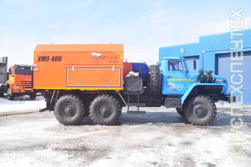 УМПП-400 УЗСТ 6892-02 на шасси КАМАЗ-43502-3036-45/3038-45 без спального места, вентилятор ВР-280-46-5, горелки Riello RG4S (220 В) – 2 шт., бак топливный 350 л., теплообменник - двухсекционный трубчатый из нержавеющей жаропрочной стали, количество выводов для рукавов - 3, вместимость пеналов для рукавов - 10, средства безопасности.